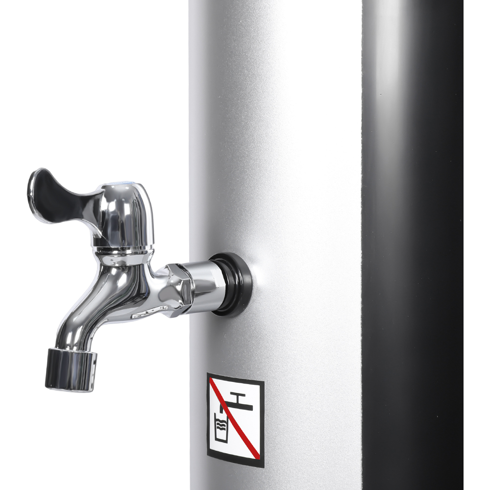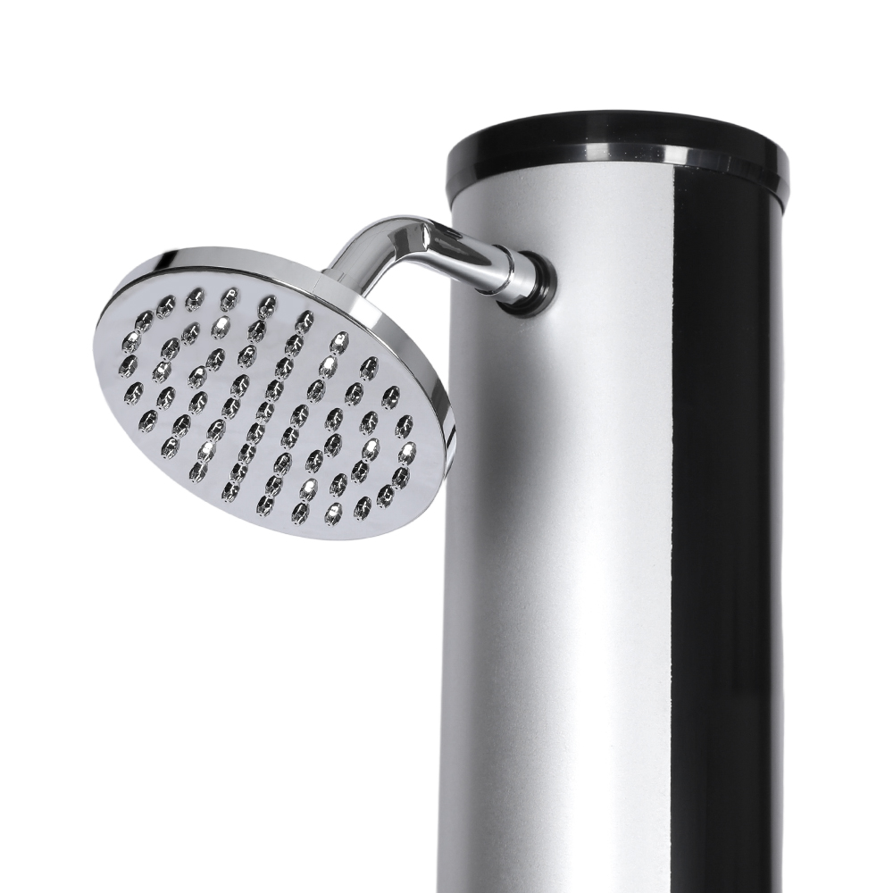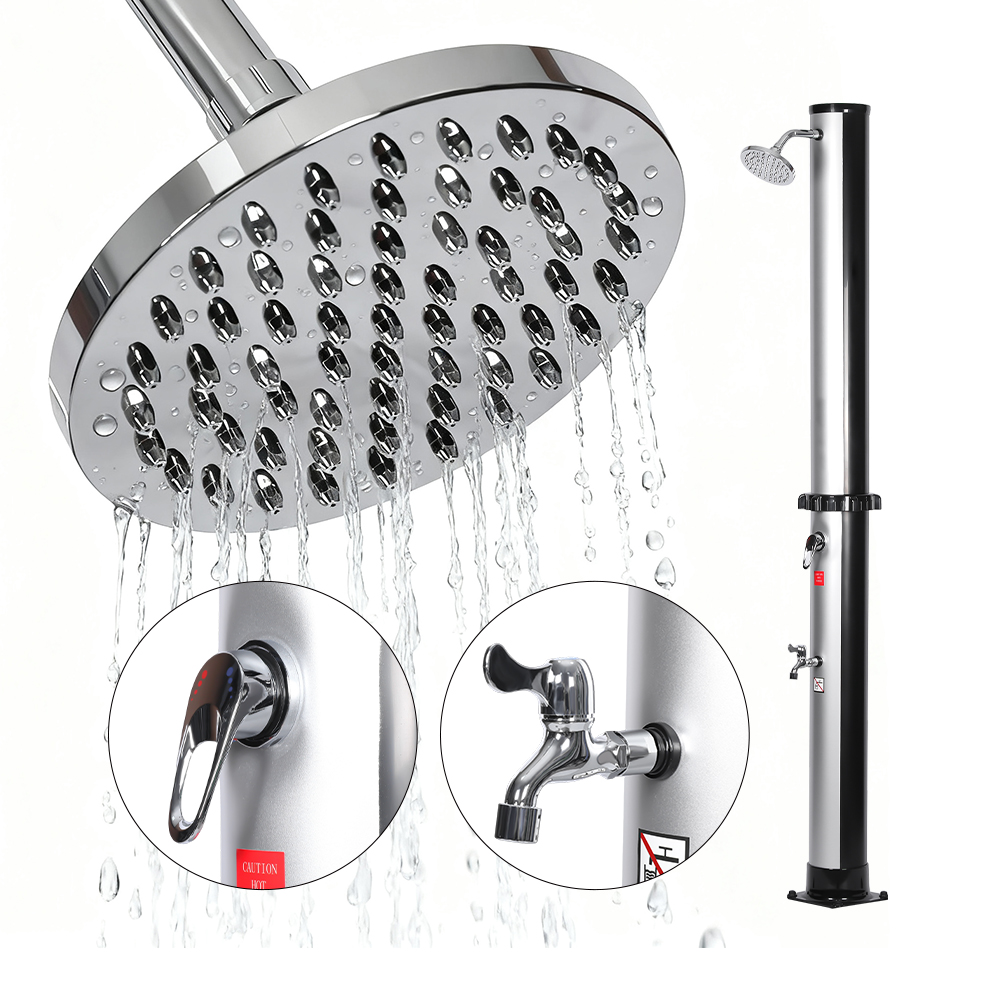 Esta LY35L02-CR Ducha Solar Ajustable y a Prueba de Agua combina practicidad con comodidad, con un gran tubo de ducha que se calienta hasta alrededor de 60 °C utilizando solo la luz solar, eliminando la necesidad de electricidad. Simplemente conecte una manguera de jardín normal para llenar el tubo de la ducha, lo que facilitará que toda la familia disfrute de una refrescante ducha al aire libre en el jardín, junto a la piscina o mientras acampa. Una cómoda bandeja de metal mantiene los elementos esenciales del baño, como jabón o champú, a su alcance, mientras que un canal de drenaje cuidadosamente diseñado en la parte inferior evita que se acumule agua, manteniendo el área limpia y segura. Para aumentar la comodidad, el cabezal de ducha ajustable permite un control flexible del chorro de agua, lo que le permite adaptar el flujo a sus preferencias personales. Su spray estilo selva tropical ofrece una experiencia de ducha relajante y de sensación natural, transformando cada enjuague en un momento de relajación.